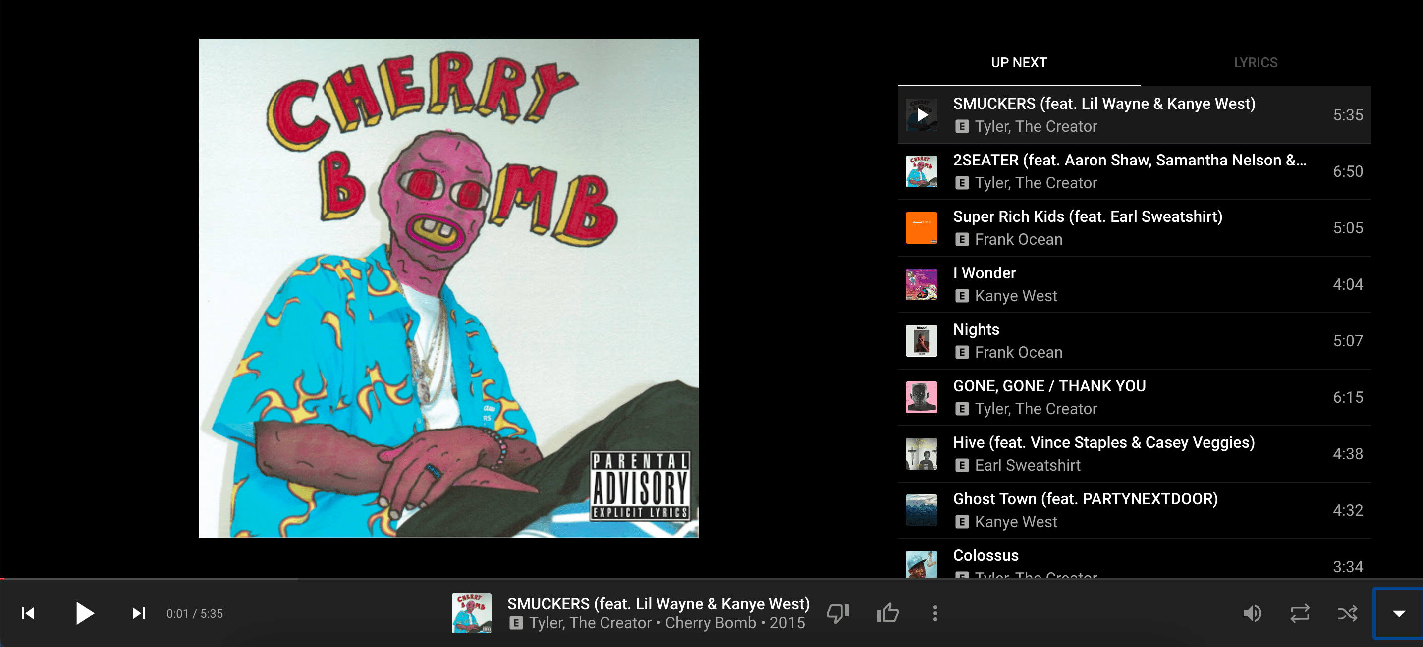 This queue features songs from Tyler, Kanye West, Frank Ocean, and Earl Sweatshirt. It makes sense that the algorithm would recommend more songs from the same artist. "2SEATER" is a decent recommendation, though it's a lot more somber in tone. But it shares jazzy instrumentals and a beat switch. "Colossus" is also an okay recommendation, but is also a lot more somber with its piano instrumental. However, Tyler is also the perfect example why recommending songs from the same artist doesn't always work. "GONE, GONE / THANK YOU" is off of his latest album, IGOR, and is very much not a hip hop album. "SMUCKERS" does have a Kanye inspired sound, but it's a bit more reminiscent of his College Dropout / Late Registration days. "I Wonder" is an okay recommendation with its uplifting tone and piano keys, but features a more synthy beat and a slower pace. "Ghost Town" is off of one of Kanye's most recent work, Ye, and is very different from his early work, featuring a heavy guitar driven beat and more sing-songy approach. Frank Ocean makes R&B music. The algorithm is likely recommending Frank Ocean because the two artists are heavily associated as they both came up as a part of Odd Future. Tyler has toyed with more R&B sounds, especially on Flower Boy, but "SMUCKERS" is not one of those tracks. Earl Sweatshirt similarly was a part of Odd Future and is associated with Tyler. However, "Hive" is a dark minimal hip hop banger. It's clear the algorithm here is just recommending songs from similar artists as all artists that appear here are either heavily associated (Earl Sweatshirt and Frank Ocean), or used to have a similar sound (Kanye West). I consider 3 out of the 8 songs okay to decent recommendations (37.5%), but not one is a good recommendation. They all fail to match the energy and jazzy sound that "SMUCKERS" has.