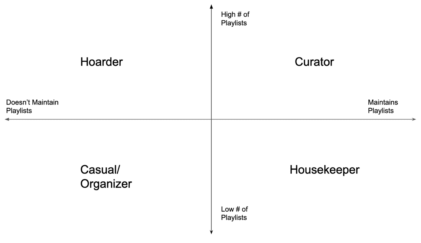 I found that a low number of playlists and not maintaining playlists seem to manifest in two ways: Casual and Organizer. Someone who is Casual just isn't that into music. They don't have a lot of music they listen to so they don't really have the need for a large number of playlists or even to maintain them sometimes. They will usually opt for other mediums (e.g. listening to podcasts, using machine generated playlists, listening to the radio). An Organizer is someone who has a small number of playlists, typically categorized just by genre. Everything is loosely organized because of these broad categorizations. Their playlists will wind up being really long as they continuously add songs that fit into the genre, but they never go back to delete songs they don't listen to anymore. Their playlists can vary wildly in mood as they are not broken into subgenres. They will likely find themselves a little frustrated constantly skipping songs when shuffling a playlist as they will get jarring mood shifts and lots of songs they don't enjoy anymore.